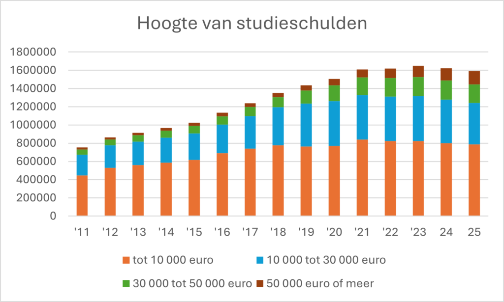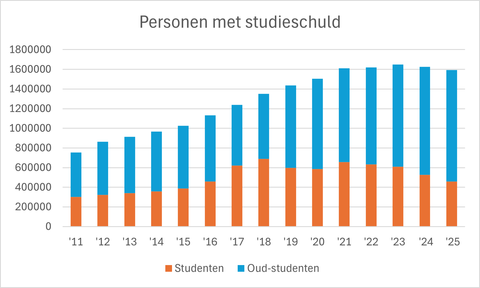 Volgens de nieuwste cijfers van statistiekbureau CBS bouwen nu bijna 460 duizend studenten een studieschuld op. Dit zijn dus studenten die een lening afsluiten naast hun basisbeurs en (eventueel) aanvullende beurs. Het zijn er minder dan in het piekjaar 2021, toen 657 duizend studenten in het mbo, hbo en wo een studieschuld hadden. Het aantal oud-studenten met een schuld blijft daarentegen groeien: het zijn er inmiddels 1,1 miljoen.
