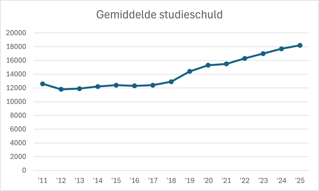 Ook de gemiddelde studieschuld stijgt. Het gaat inmiddels om meer dan 18 duizend euro. De snelle stijging kwam niet meteen in 2015 toen het nieuwe leenstelsel werd ingevoerd, omdat de basisbeurs alleen voor nieuwe studenten werd afgeschaft. Het duurde dus even voor de gevolgen zichtbaar werden.