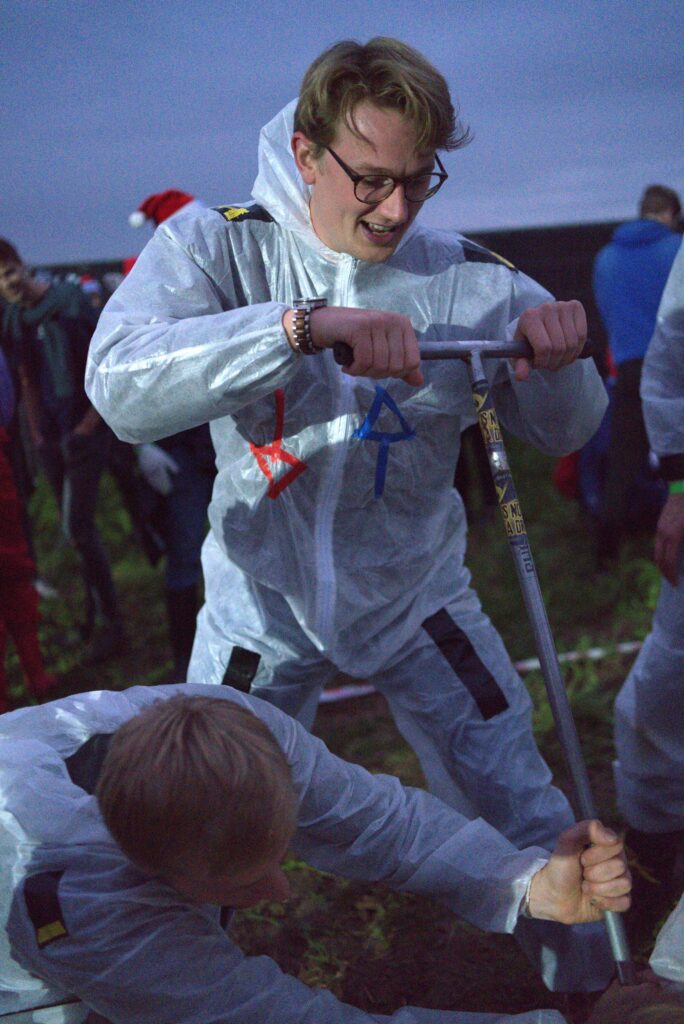 Omringd door groepen studenten verkleed als kikkers, bunny’s, brandweerlui, boeven of reptielen, was dit een avond om niet snel te vergeten. Iedereen werkte zich uit de naad om de Wageningse geschiedenisboeken in te gaan. Links en rechts van een platgetrapt weiland waren kleine veldjes waarop telkens twee teams het grondboor-duel aangingen. De bedoeling van de wedstrijd is dat de teams de grondboor zo snel mogelijk volledig in de grond boren. Het duel eindigt als een van de teams de lege boor in het gat kan zetten.